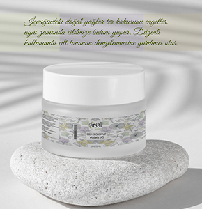 Terlemenin önemini dikkate alarak doğal içerikle formülize ettiğimiz ARSAL DOĞAL KREM DEODORANT 'larımız terlemeyi engellemeden ter kokusunu engeller.LİMON,LAVANTA,YASEMİN uçucu yağlı seçenekleriyle gün boyu kendinizi, kendinize zarar vermeden ferah ve temiz hissetmenizi sağlar.
